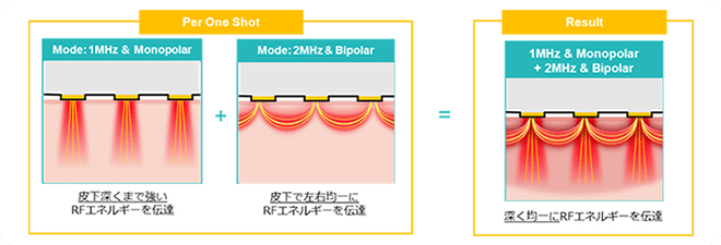 DIAMONDチップでのタイトニング治療は、1ショットでモノポーラとバイポーラが照射される独自の照射方式が採用されています。真皮深層までエネルギーを深く伝達するモノポーラと、表皮~真皮浅層に電極間で均一に密度の高いエネルギーを伝達するバイポーラを、効果的に皮下に伝達することができます。