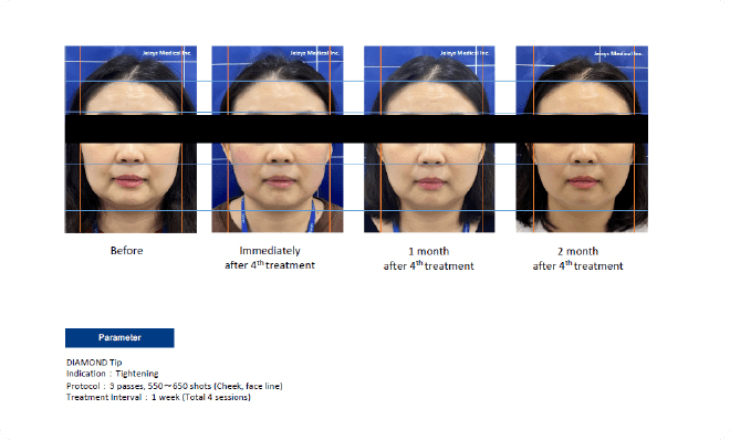 コラーゲンの収縮により即時的な肌の引き締め効果が得られ、熱影響を受けた線維芽細胞は、中長期的にコラーゲンとエラスチンの増生を促します。