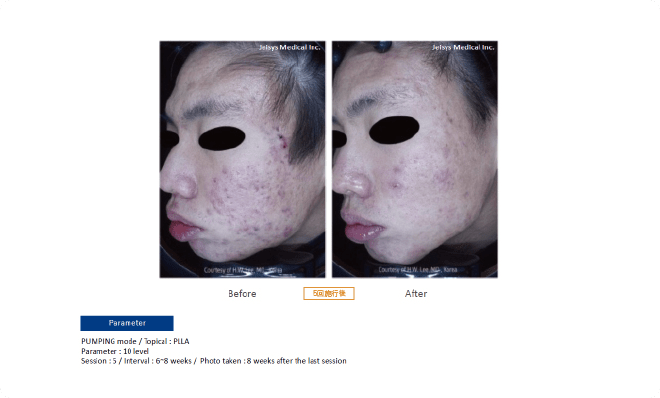 この治療は、生体適合性のある生分解性合成ポリマーであるPLLA(ポリL-乳酸)を、RF(高周波)ニードル治療機器によって皮下に送達し、PLLAの皮膚細胞免疫反応とRFニードルの熱作用によって、真皮にコラーゲンが再生成されることで萎縮性瘢痕などの皮溝を改善させることを目的とした治療です。